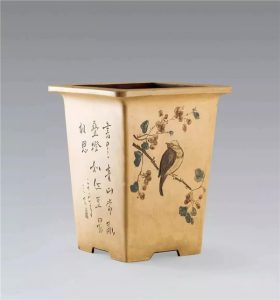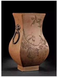▲潛陶刻 段泥刻花鳥詩文方瓶