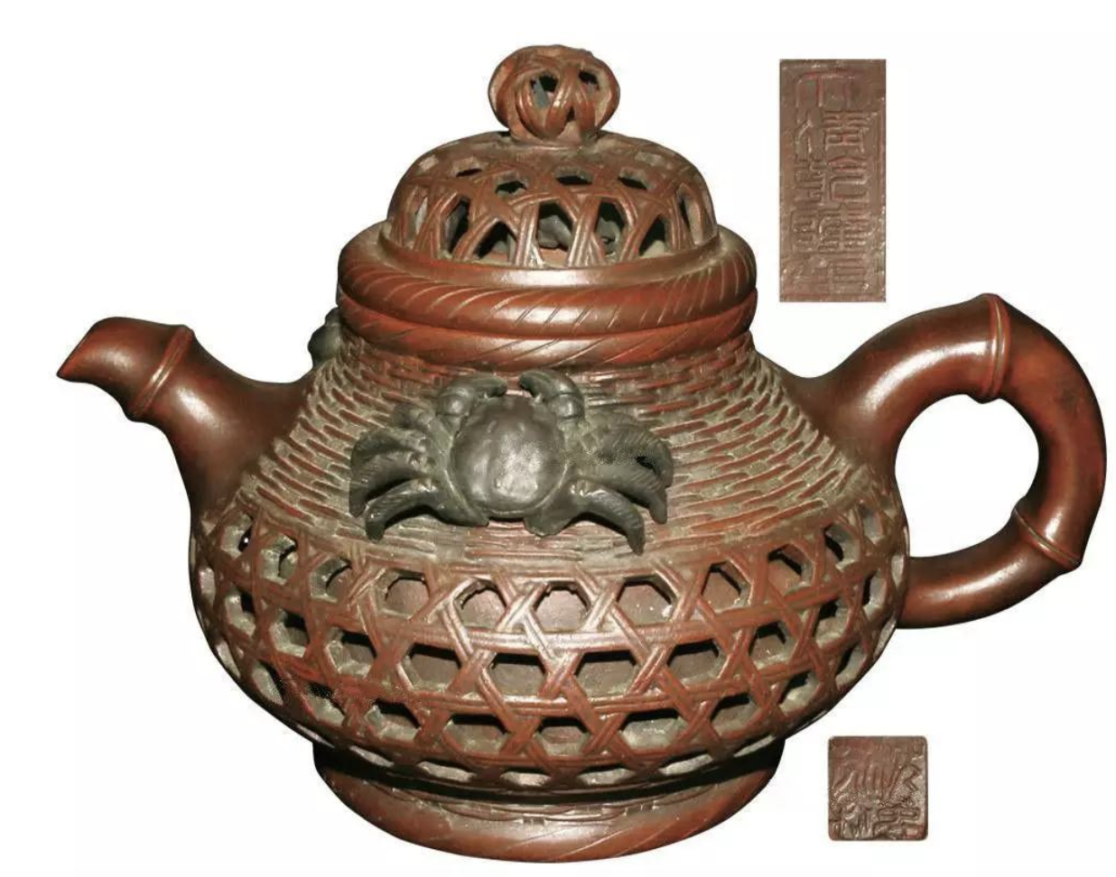 此壺嘴、把、蓋、鈕與壺身完全比率協作,容積和沉量的妥當,壺身被精巧的化妝成魚簍狀,渾身化妝有小蝦蟹,魚簍除了藤條編織樣,還以鏤空的本領粉飾,更高難度的是沒有僅壺身表面有蝦蟹,在壺蓋的鏤空之下,還雕刻了一只蟹,個中難度可想而知,由此也看來制壺巨匠的高明工藝程度。