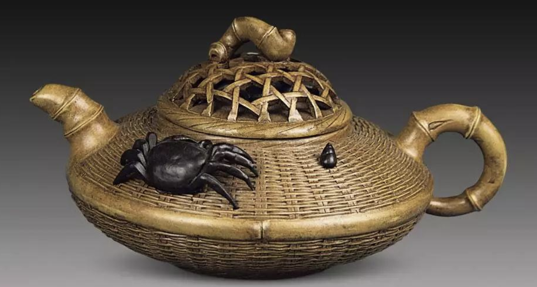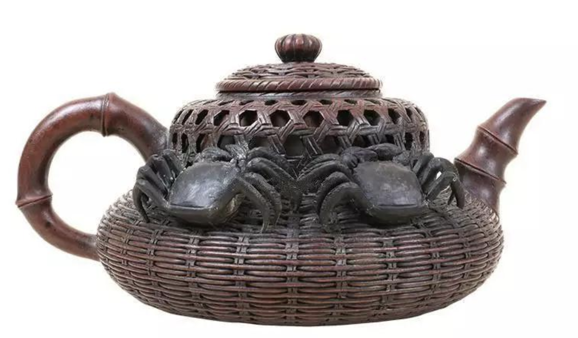 紫砂竹簍蟹圖壺