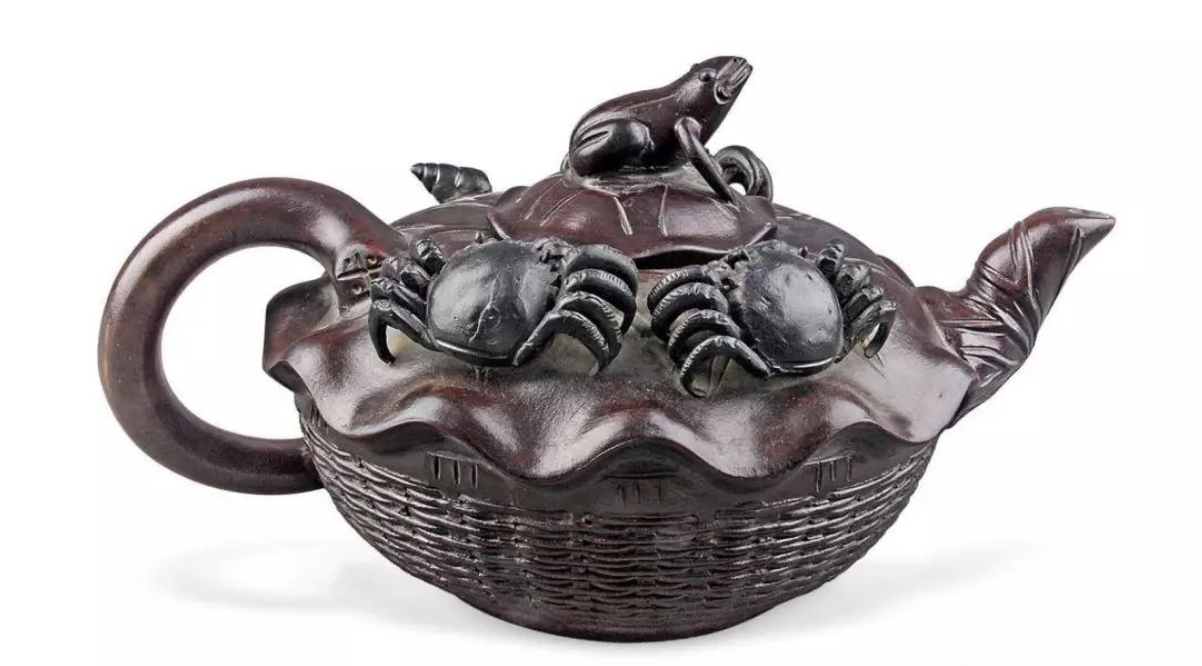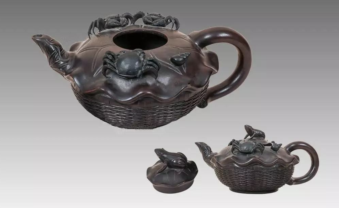 此紫砂壺將荷葉、田雞、螃蟹、竹簍等自然形骸,通過藝術提取之后,使用于紫砂創造中,使紫砂壺的藝術美感與自然生趣融為一體。不妨說,這類紫砂藝術方面的培養代表了一個時期的高峰。