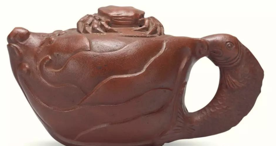 壺身似層層波浪,翻騰洶洶,動感實腳,壺鈕、壺蓋以螃蟹飾之,壺把一條鯉魚現個中,整把壺貫串完美無缺,局面靈巧。