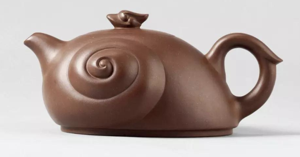 使用妥當,沒有宜過于花俊是此壺得特性。壺身以水鳶象形安排,鈕、把為其頭尾,安排局面靈巧,壺身一側為田螺,一側為螃蟹,停止而立。完全歪斜,呈動向之勢,好像秋日一副蟹胖豐產的故鄉繪卷。